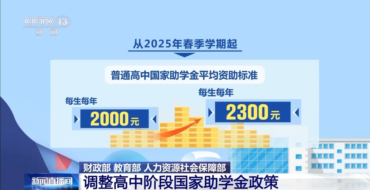 此次政策调整也涉及高中阶段学生资助政策。首先,提高普通高中国家助学金资助标准。从2025年春季学期起,将普通高中国家助学金平均资助标准由每生每年2000元提高到2300元。