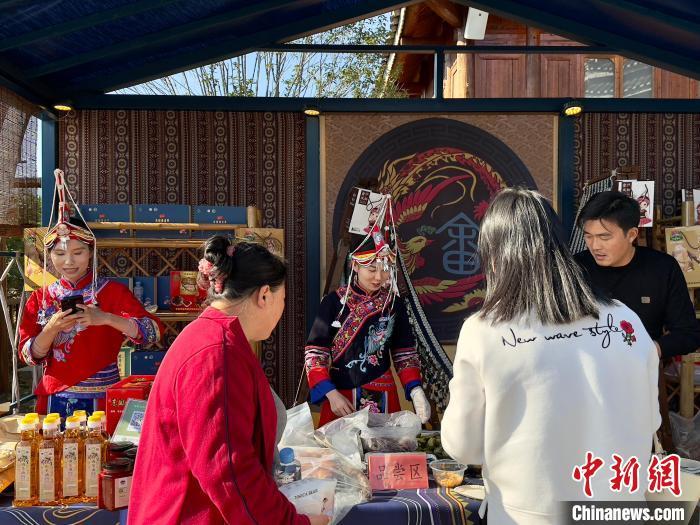 图为黄予心(中)在江西吉安金坪民族乡八寨集市售卖畲族特产。中新网记者刘子衿 摄