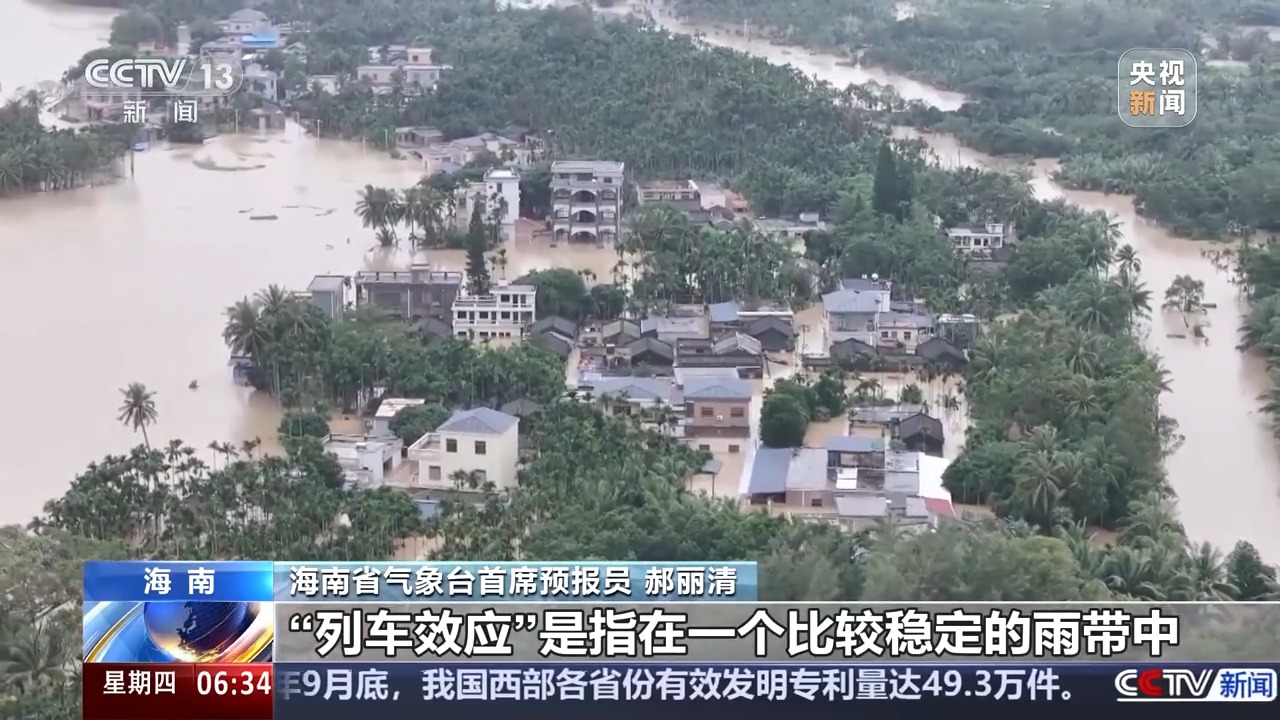 海南省气象台首席预报员 郝丽清:“列车效应”是指在一个比较稳定的雨带中,看上去整体的位置不怎么动,但是雨带里又有些单体沿着雨带不停往前走。就像一个列车看似是不动了,但是它在一个地点上不断有云体从上面经过的。就海南岛东部来说,它承受了很多的雨水,所以造成连续两天的特大暴雨。