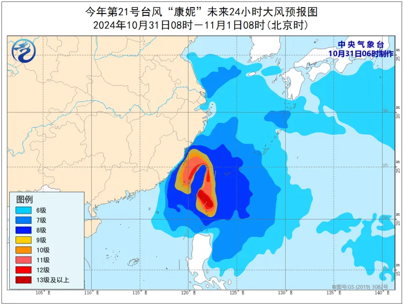 大风预报:10月31日08时至11月1日08时,受冷空气和“康妮”的共同影响,东海大部及钓鱼岛附近海域、台湾海峡、台湾以东洋面、巴士海峡、南海北部及东沙群岛附近海域、浙江沿海、福建沿海、台湾岛沿海将有7-9级大风,阵风10-11级;其中台湾海峡、台湾以东洋面和巴士海峡的部分海域、台湾岛东部沿海、福建中部沿海的风力有10-12级,阵风13-14级,台风中心经过的附近海面风力有13-16级,阵风17级及以上。