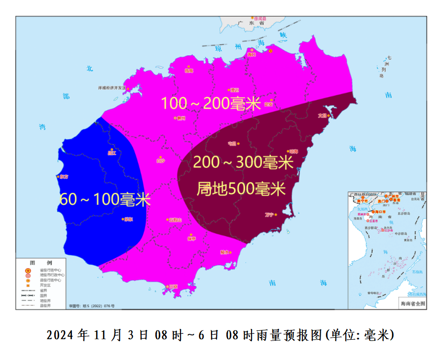 预计,11月3日08时~6日08时累积雨量:文昌、琼海、万宁、屯昌和琼中200~300毫米、局地可达500毫米;海口、定安、澄迈、临高、儋州、白沙、五指山、保亭、陵水和三亚100~200毫米;昌江、东方和乐东60~100毫米。