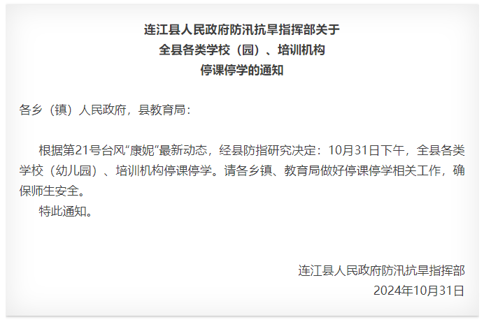 连江发布通知:停课停学
