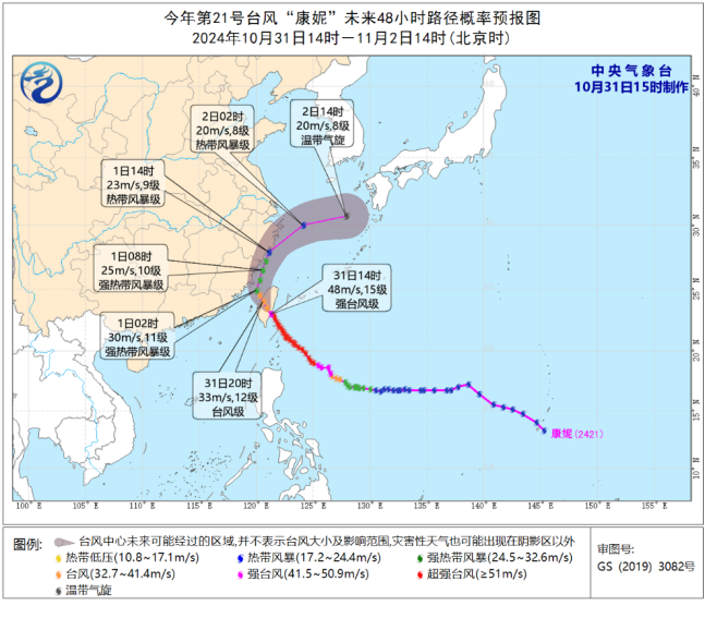 预计,“康妮”将于31日晚上进入台湾海峡,以后在闽浙近海逐渐转向东北方向移动,11月2日上午在东海北部变性为温带气旋;仍不排除“康妮”在闽浙近海东北行过程中登陆福建和浙江沿海的可能性。