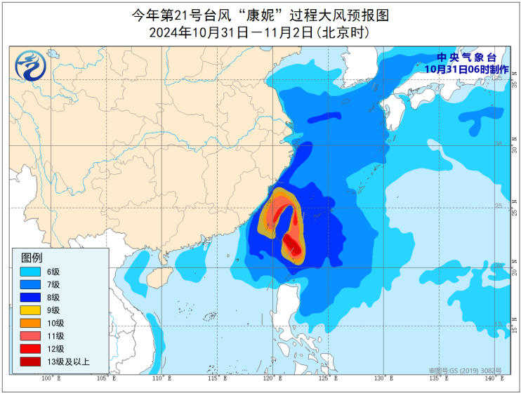 大风预报:31日至11月2日,受冷空气和“康妮”的共同影响,黄海南部、东海大部及钓鱼岛附近海域、台湾海峡、台湾以东洋面、巴士海峡、南海北部及东沙群岛附近海域、浙江沿海、福建沿海、台湾岛沿海有7~9级大风,阵风10~11级;台湾海峡、台湾以东洋面和巴士海峡部分海域、台湾岛东部沿海、福建中部沿海风力有11~12级,阵风13~14级,台风中心经过的附近海面风力有13~16级,阵风17级及以上。