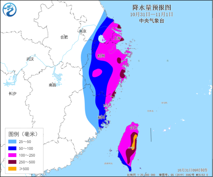 降雨预报:31日至11月1日,台湾岛、福建东北部、浙江中东部、上海、江苏南部等地有暴雨,部分地区大暴雨(累计降雨量100~200毫米),台湾岛东部、福建东北部、浙江东部、上海东南部等地局地有特大暴雨(降雨量250~400毫米,台湾岛东部400~800毫米);最大小时降雨量40~70毫米,台湾岛局地80毫米以上。