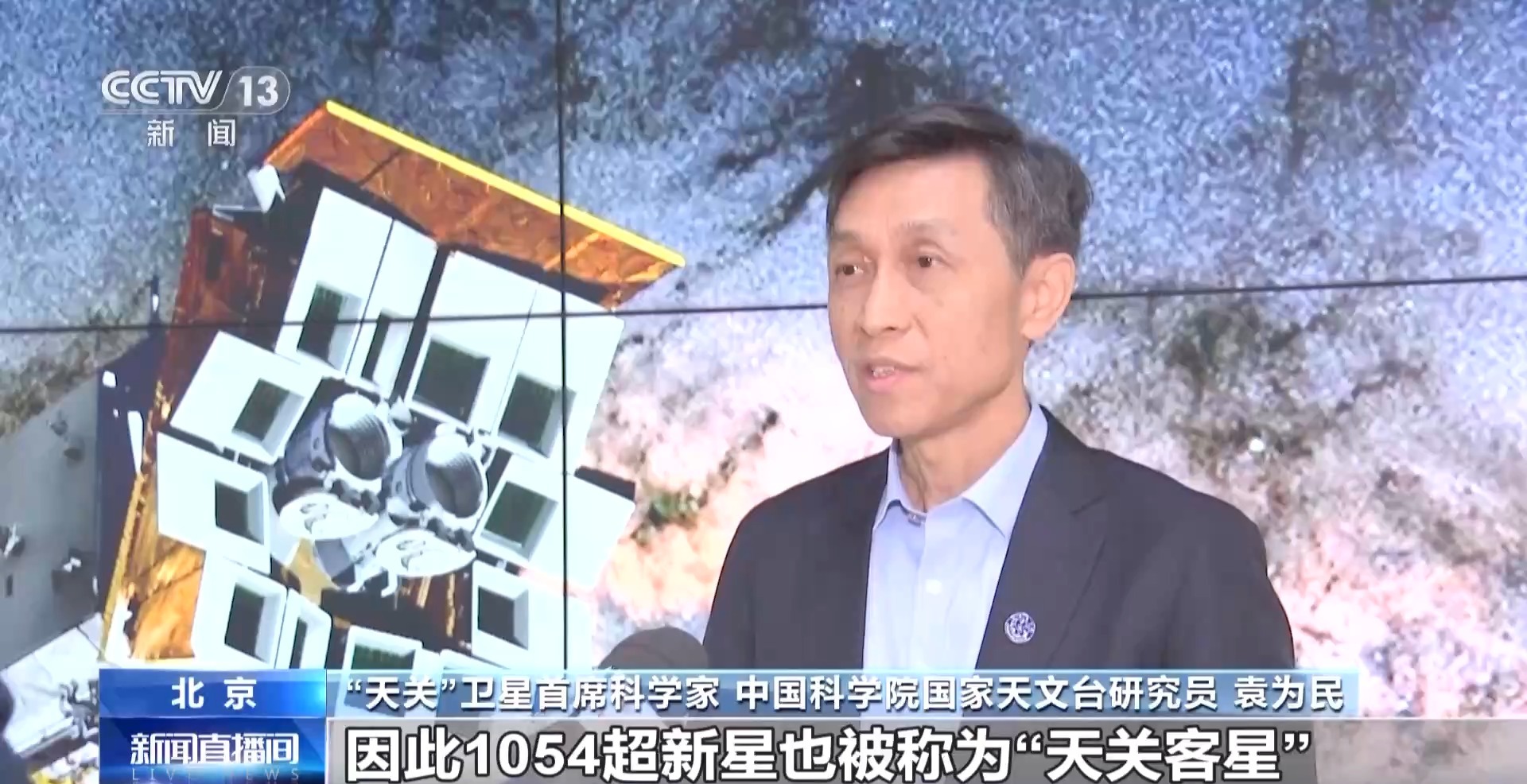 “天关”卫星首席科学家、中国科学院国家天文台研究员 袁为民:当时古代把超新星和新星这样的爆发天体称为“客星”,因此1054超新星也被称为“天关客星”。“天关客星”是中国古代天文学家发现的非常著名的一个超新星,它的记录非常详尽,对中国和世界天文学都做出了非常重要的贡献。