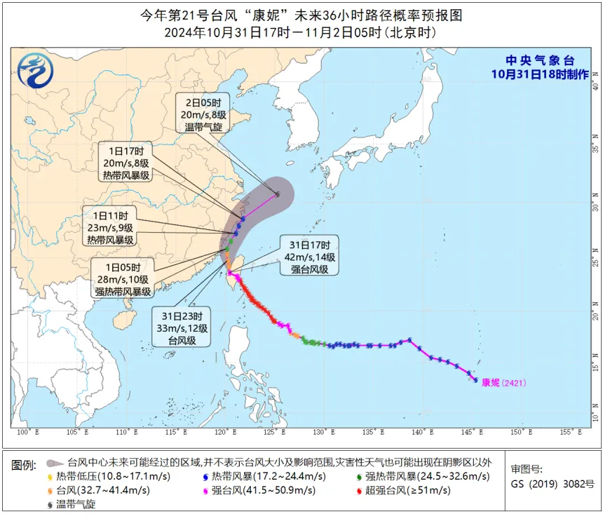 今年第21号台风“康妮”的中心已于10月31日14时前后在台湾省台东县成功镇沿海登陆,登陆时由超强台风级减弱为强台风级,中心附近最大风力有15级(48米/秒),中心最低气压945百帕。今天夜间进入台湾海峡,给浙江省带来较大风雨影响,宁波将迎来暴雨到大暴雨天气。