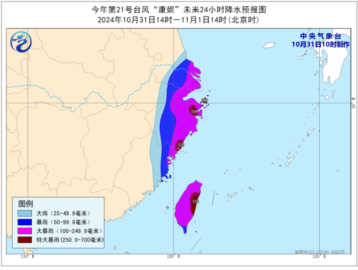 据中央气象台,预计10月31日14时至11月1日14时,福建东北部、浙江中东部、上海、江苏南部等地有暴雨或大暴雨,其中,福建东北部、浙江东部等地局地有特大暴雨(250-300毫米);台湾岛有大暴雨,其中台湾岛东部局地有特大暴雨(250-700毫米)。