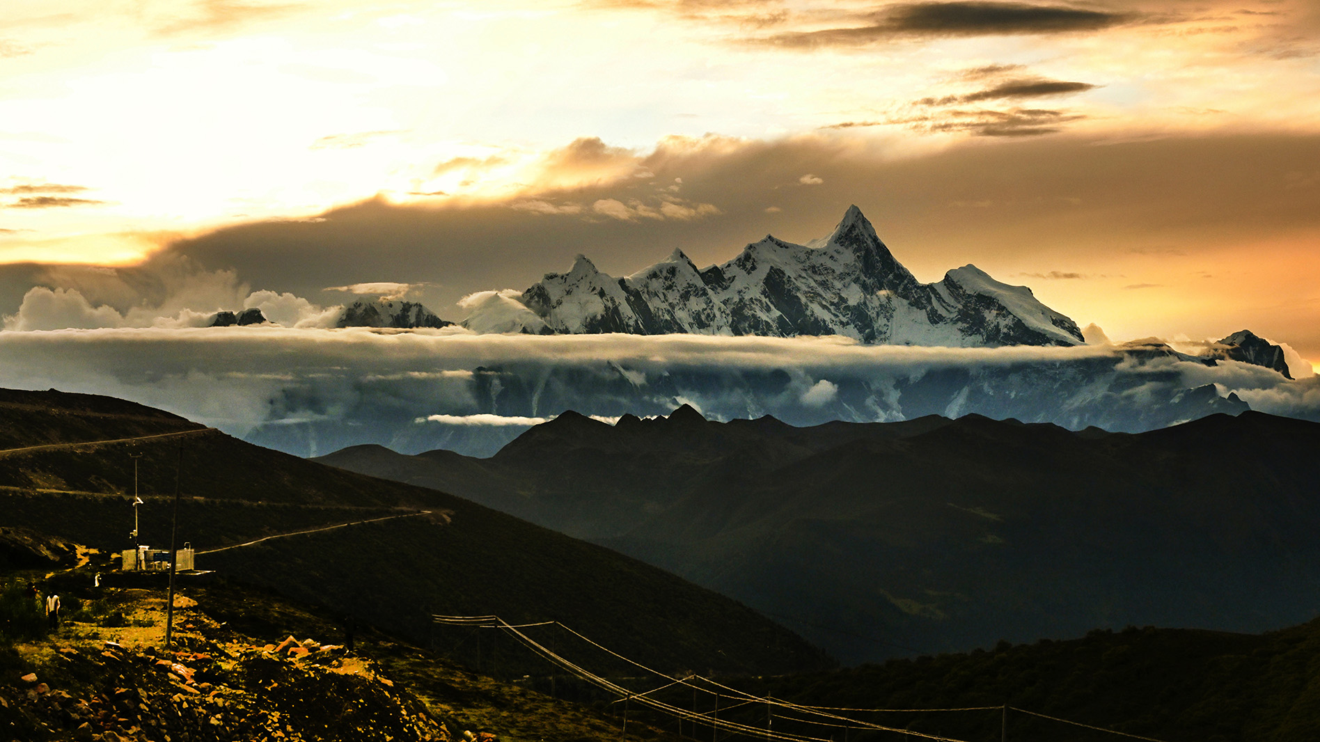 南迦巴瓦,矗立于天际,云雾缭绕间,仿佛天地间的守护神,静静守望着这片净土。金色的阳光洒在峰顶,如同神祇降临,圣洁而庄严。山间风吹云动,仿佛天地间最悠扬的乐章,令人心旷神怡。