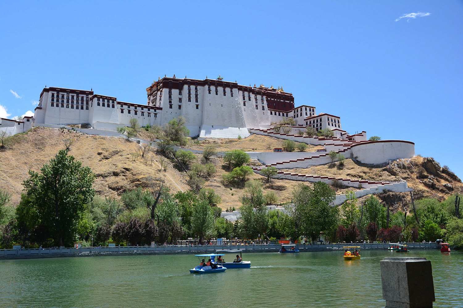 布达拉宫,屹立于荒山之巅,那红白相间的宏伟建筑,在阳光的映照下,散发着神秘而庄重的气息。它高高在上,俯瞰着这片大地,仿佛在诉说着古老的故事。山脚下,却是另一番景象。绿树成荫,生机勃勃。清澈的湖水宛如一面巨大的镜子,倒映着蓝天白云和周围的美景。游人悠然地在湖中划船,荡起层层涟漪。小船在湖面上缓缓前行,人们欢声笑语,享受着这宁静而美好的时光。布达拉宫的庄严与山脚下的生机相互映衬,构成了一幅令人陶醉的绝美画卷。