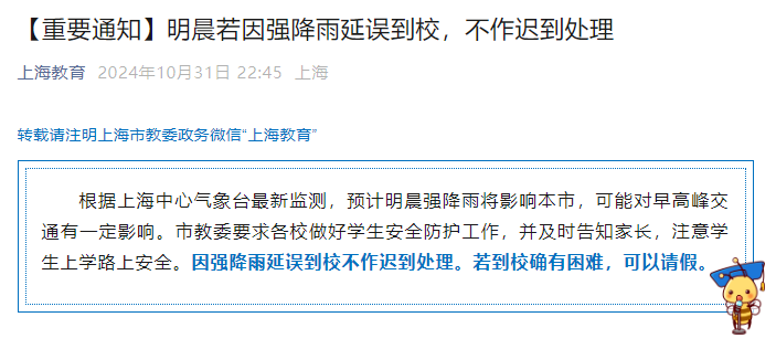 根据上海中心气象台最新监测,预计明晨强降雨将影响本市,可能对早高峰交通有一定影响。市教委要求各校做好学生安全防护工作,并及时告知家长,注意学生上学路上安全。因强降雨延误到校不作迟到处理。若到校确有困难,可以请假。