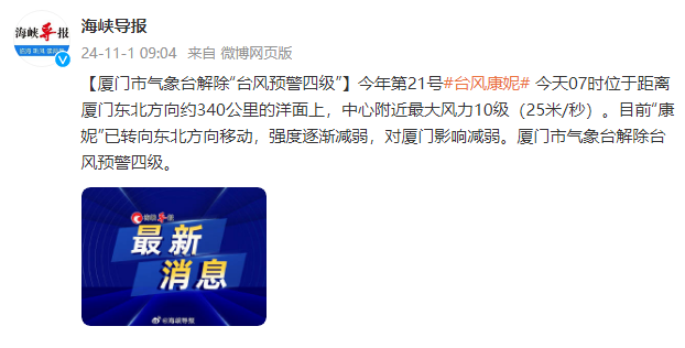 今年第21号台风“康妮”今天07时位于距离厦门东北方向约340公里的洋面上,中心附近最大风力10级(25米/秒)。目前“康妮”已转向东北方向移动,强度逐渐减弱,对厦门影响减弱。厦门市气象台解除台风预警四级。