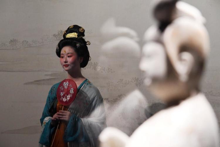 身着复原唐装的演员在西安博物院为游客呈现唐朝生活风貌。新华社记者 李一博 摄