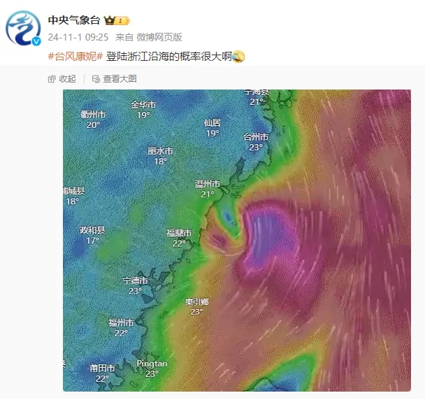 “康妮”登陆浙江沿海的概率很大