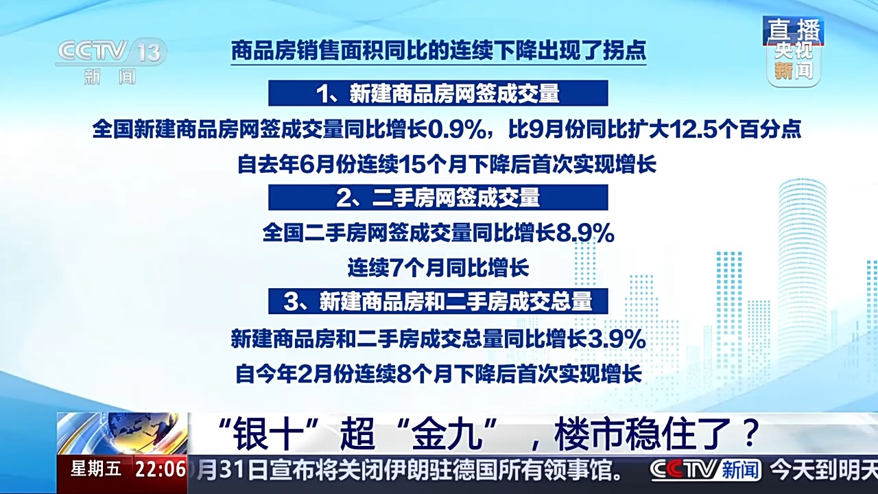 记者从住房城乡建设部获悉,10月份商品房成交同比、环比实现“双增长”,17年来首次楼市“银十”超“金九”。这个“银十”的成色究竟怎样?如何看待接下来的趋势?更好地促进房地产市场止跌回稳,一系列的政策措施又在怎样快速推进?一起关注→