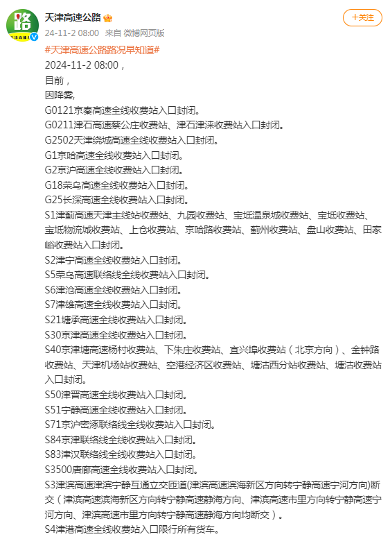 S1津蓟高速天津主线站收费站、九园收费站、宝坻温泉城收费站、宝坻收费站、宝坻物流城收费站、上仓收费站、京哈路收费站、蓟州收费站、盘山收费站、田家峪收费站入口封闭。