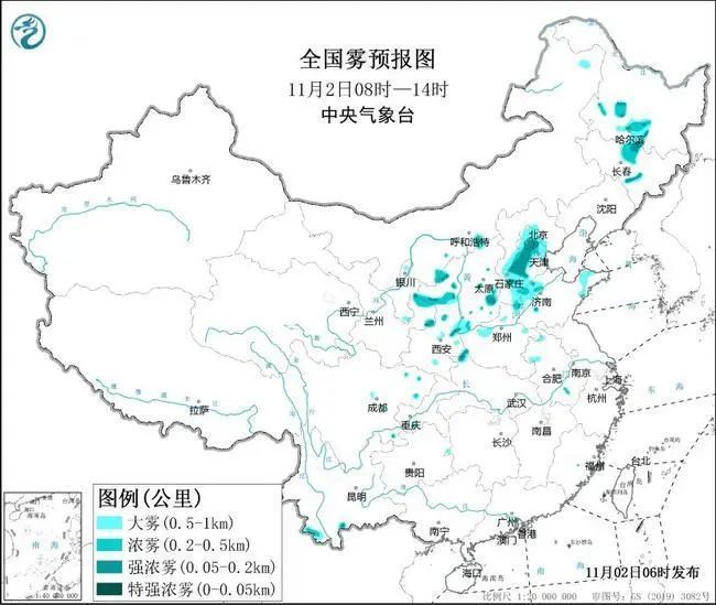11月2日早晨至上午,北京、天津、河北中南部、山东西部、山西中南部、陕西中北部、黑龙江南部、吉林中部等地有大雾天气,其中,北京中南部、河北中南部、陕西中北部等地的部分地区有能见度不足500米的浓雾,局地有能见度不足200米的强浓雾。