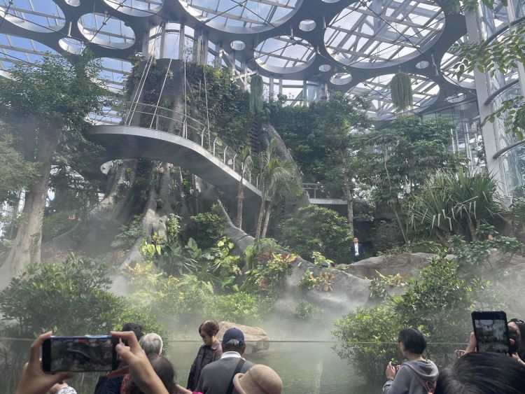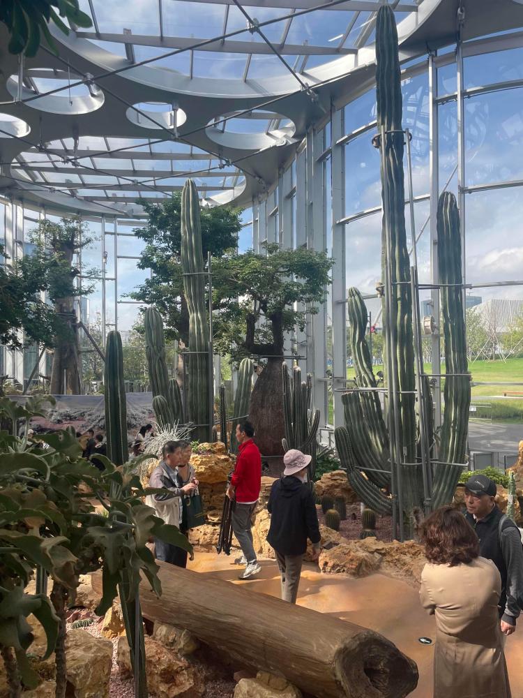 这座目前亚洲最大的玻璃温室花园,占地面积约为2.2万平方米,由海市沙洲、云上森林和云雾峡谷三大主题场馆组成。走进场馆,里面囊括了沙漠、雨林、峡谷等不同风光,有800多岁的油橄榄树、30吨重的菩提树、世界上最高的仙人掌品种和全国最大的温室猴面包树。