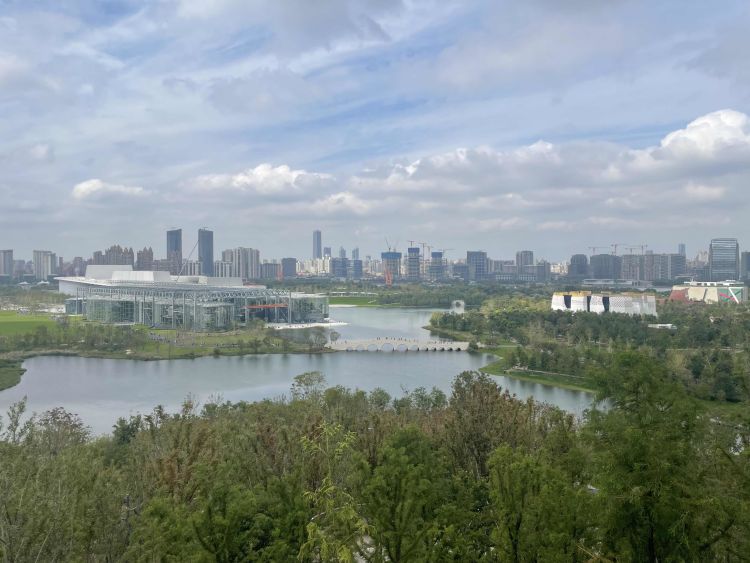 站在双子山顶,远处的城市天际线和卢浦大桥、南北高架以及黄浦江两岸美景尽收眼底,山脚下是亚洲最大温室花园、中心湖、十一孔桥。
