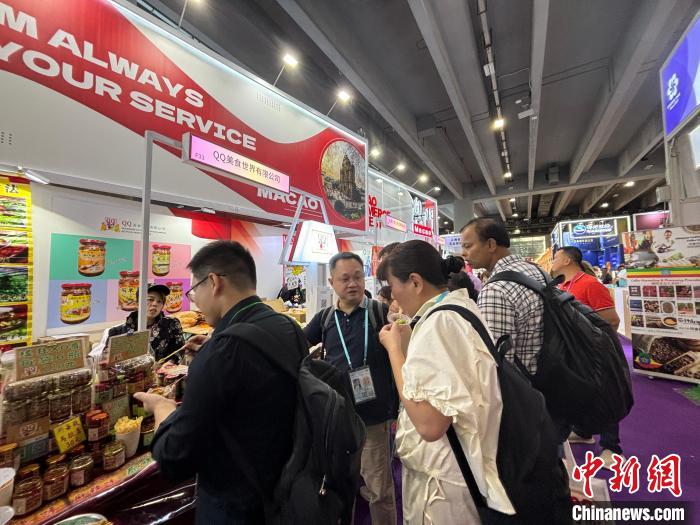 在澳门展馆,19家澳门企业带来澳门手工点心、花旗参话梅、瑶柱XO酱、葡萄酒等特色美食,吸引采购商驻足品尝。