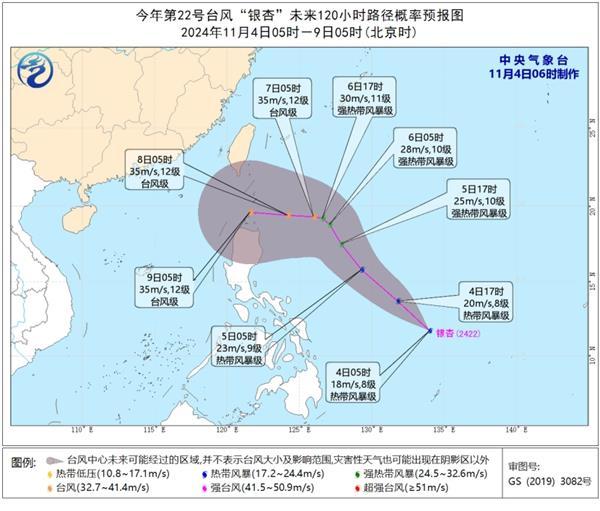 今年第22号台风“银杏”(热带风暴级,英文名称:Yinxing;名字来源:中国;名字意义:一种原产于中国的树)已于今天(11月4日)早晨在西北太平洋洋面上生成。早晨5时,其中心位于菲律宾马尼拉东偏南方向约1450公里的洋面上,即北纬11.7度、东经134.0度。中心附近最大风力有8级(18米/秒),中心最低气压1000百帕,七级风圈半径180公里。
