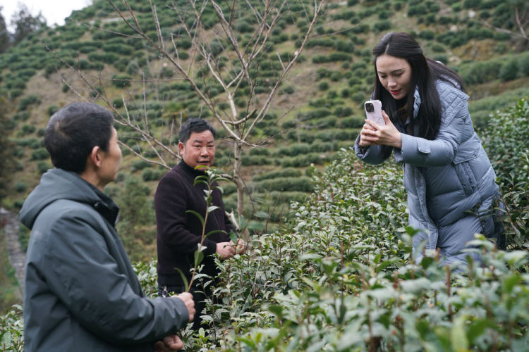 林红梅(右一)在安康市紫阳县城关镇一处茶山上拍摄记录茶园春管情况。新华社记者 邵瑞 摄