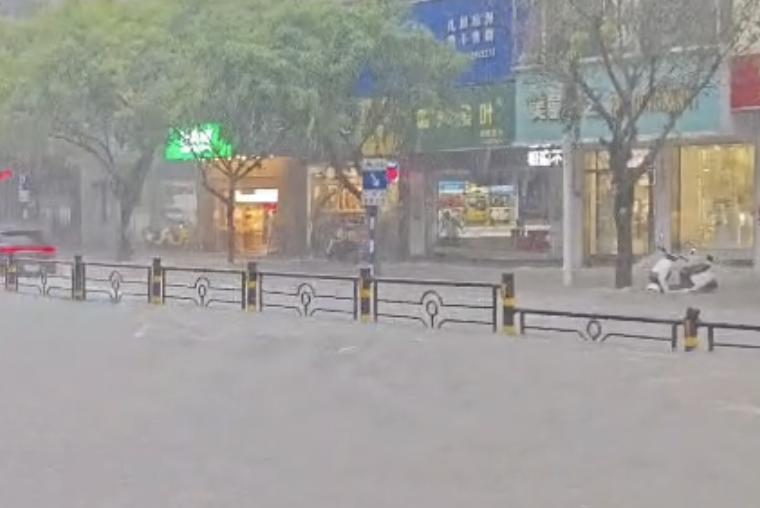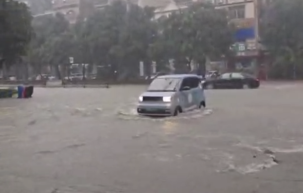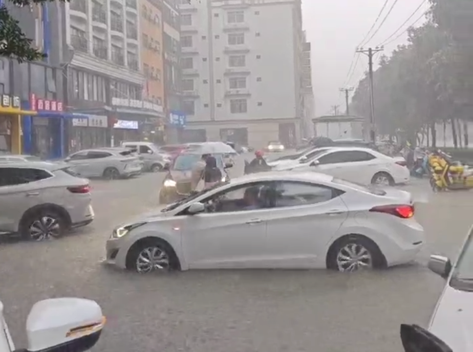 11月4日上午9点半,受暴雨影响,琼海市兴海中路实验小学路段严重积水,车辆行人通行受阻。记者 苏桂除 摄