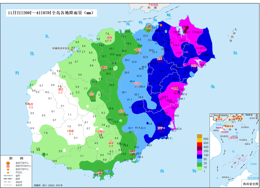 据统计,2日20时—4日07时,文昌、琼海、海口、万宁、琼中、定安和屯昌7个市县共74个乡镇(区)雨量超过50毫米,文昌、琼海、海口和万宁4个市县共31个乡镇(区)量超过100毫米,文昌和琼海2个市县共3个乡镇雨量超过200毫米,最大为文昌市锦山镇290.1毫米。