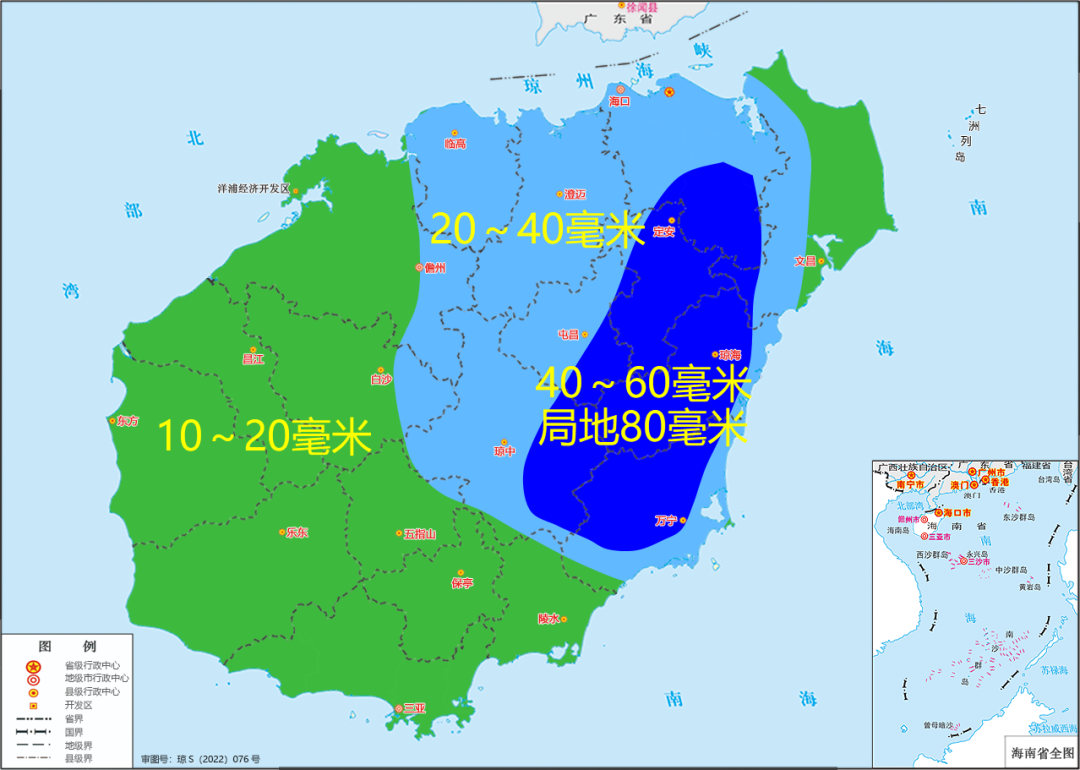 陆地方面:11月4日白天,海南岛北部、中部和东部地区有中到大雨、局地暴雨,西部和南部地区有小雨、局地中雨。预计,琼海、万宁、海口、定安、屯昌和琼中的部分乡镇雨量40~60毫米、局地80毫米,文昌、澄迈、临高、儋州和白沙的部分乡镇雨量20~40毫米,其余地区雨量10~20毫米。