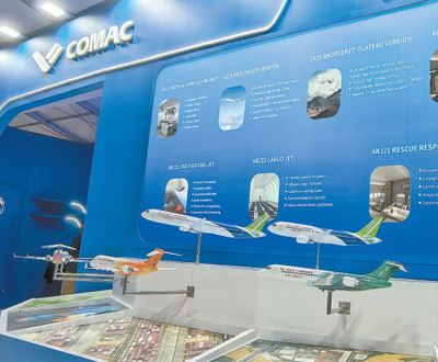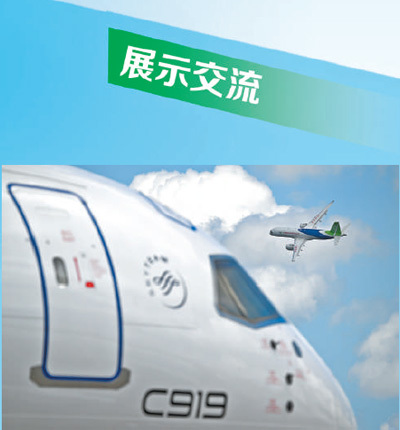 中国商飞在英国范堡罗国际航展向公众展出C919、ARJ21基本型和衍生型飞机模型。