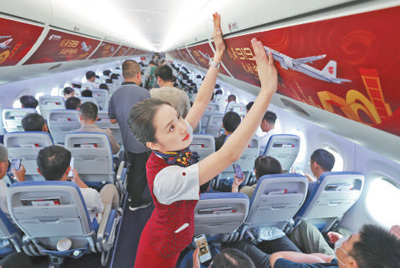 乘坐南航C919飞机首航航班的旅客在广州白云国际机场拍照留念。
