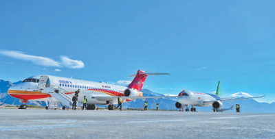 C919飞机(右)飞抵西藏拉萨,与ARJ21飞机相聚青藏高原,开展环控、航电、动力装置等高高原运行关键系统的研发试飞。