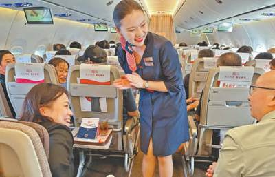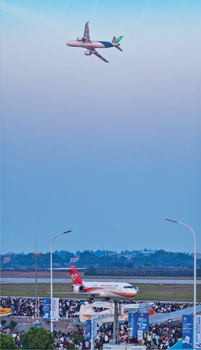 11月2日,在2024中国航空产业大会暨南昌飞行大会开幕式上,中国商飞C919和ARJ21飞机首次双机编队飞行表演,赢得现场观众热情欢呼。目前,C919已在我国三大航空公司国航、东航、南航投入商业运营,正式迈入多用户多机队运营阶段;与此同时,今年C919首次飞抵拉萨贡嘎国际机场开展高高原运行关键系统研发试飞,首次加注可持续航空燃料执行商业航班任务,首次飞出国门亮相新加坡航展……国产大飞机取得一个又一个新进展。