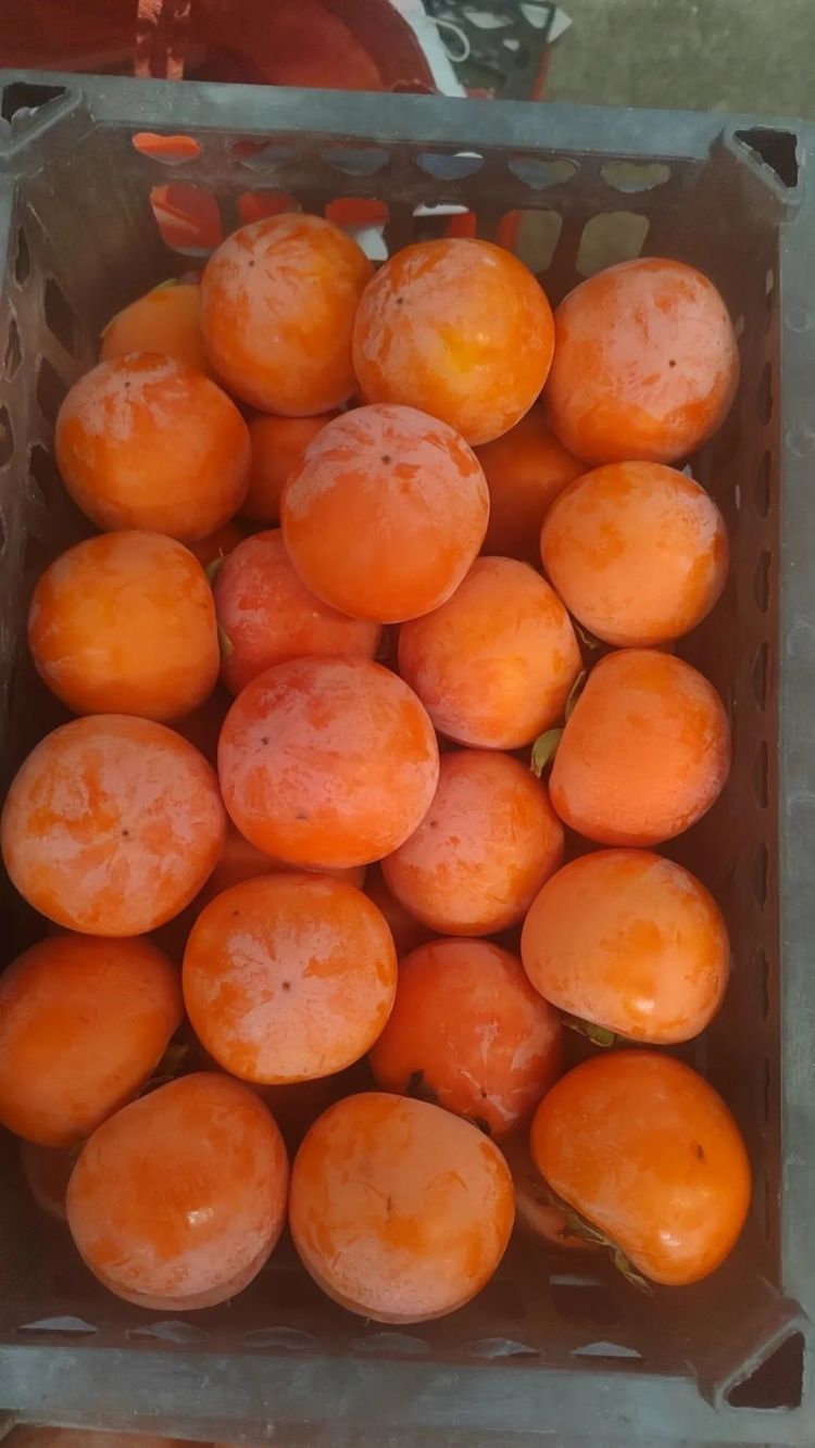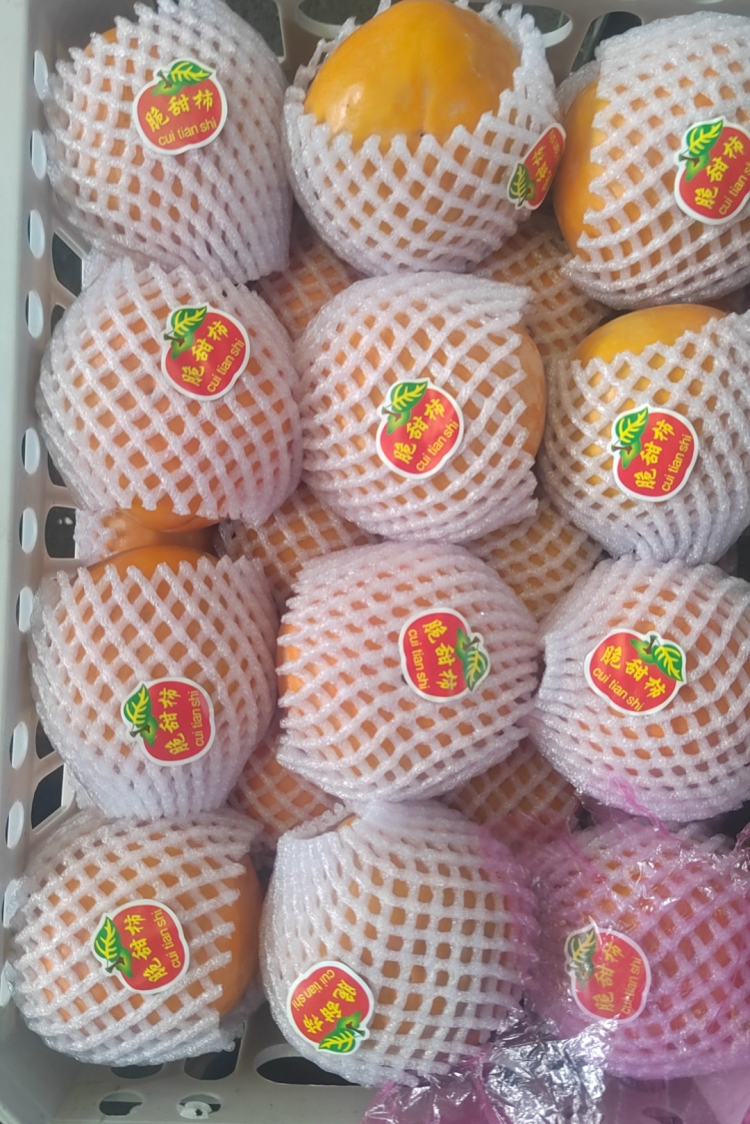 脆柿,颜色偏青黄色,随着果子的成熟,颜色会渐渐变为橙黄色。虽然颜色没有其他品种柿子的红艳,但它的甜度一点也不低,口感偏脆,清甜可口。