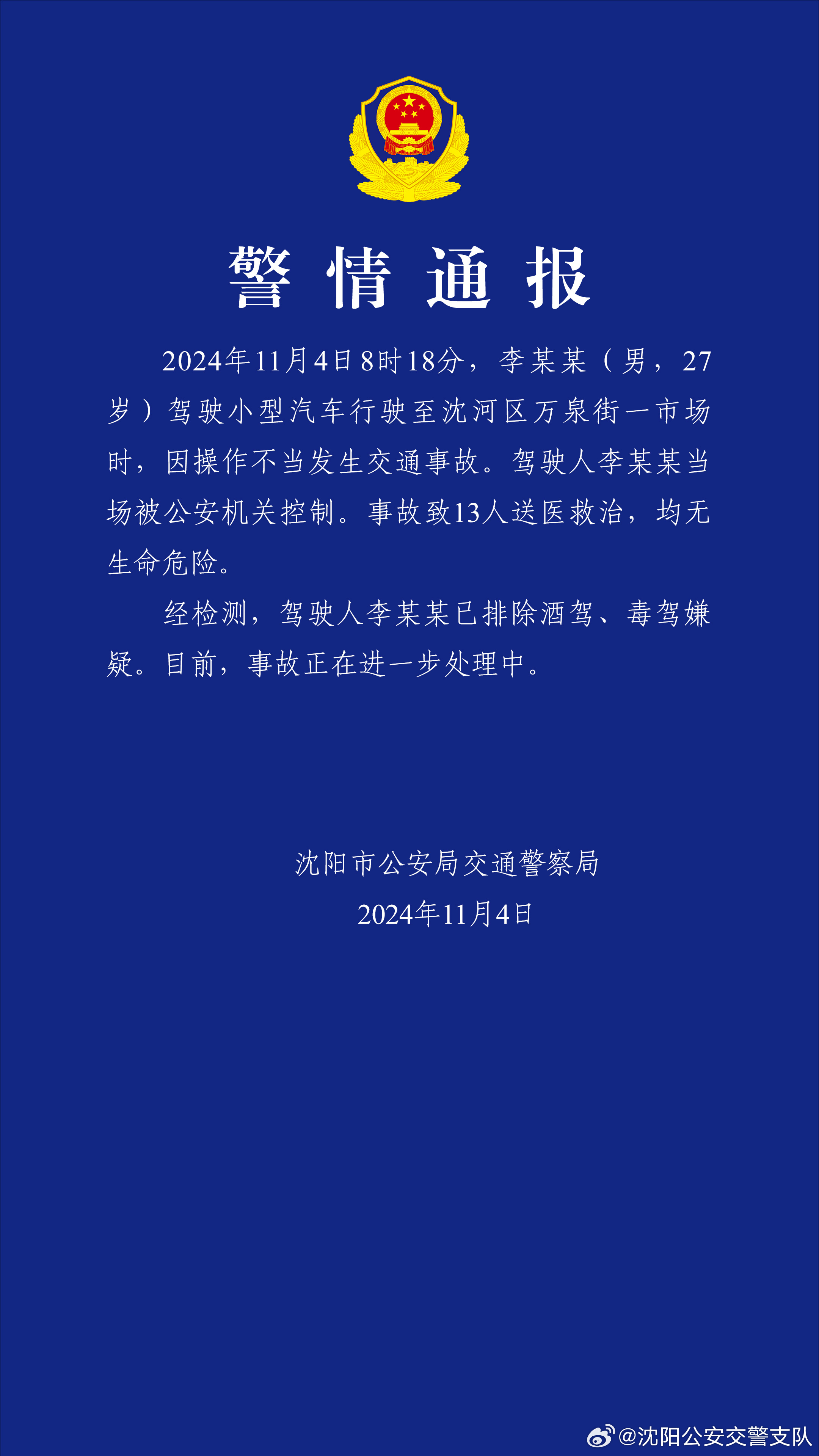 沈阳警方通报:一男子驾车因操作不当发生交通事故,致13人送医救治