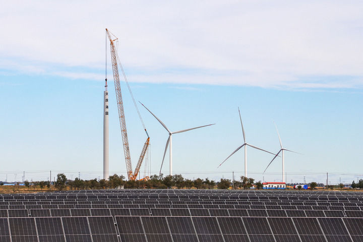 从“黑金”走向“绿电”,一台台白色风机在旷野里转动巨大叶片,一排排深蓝色的光伏板在阳光下反射熠熠光芒……老油田“追风逐日”,铺展开更多绿色发展的“新风景”。