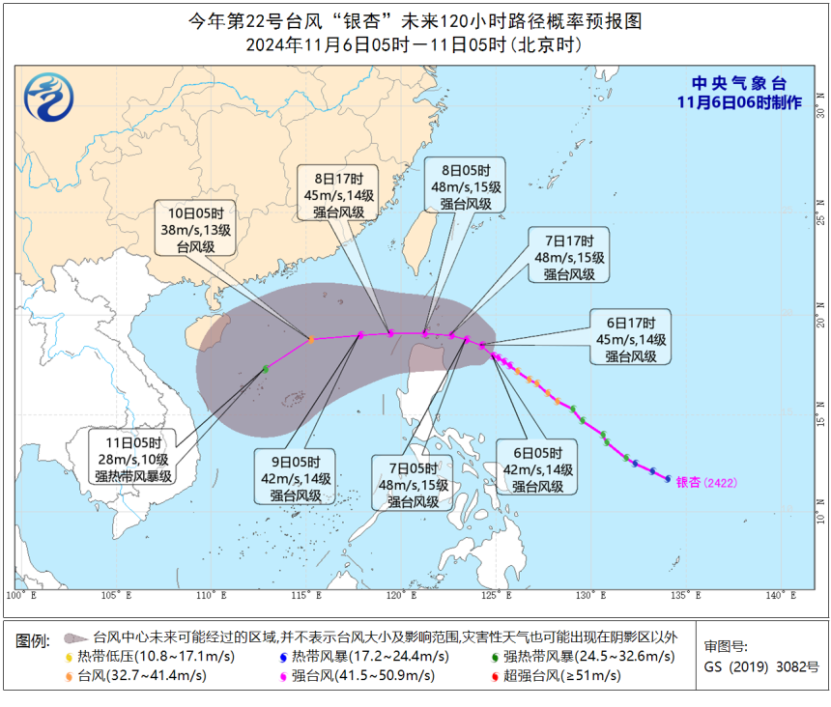 台风方面,台风“银杏”今天早晨5点钟位于菲律宾马尼拉东北方向大约560公里的西北太平洋洋面上,中心附近最大风力有14级(42米/秒)。预计,“银杏”将以每小时10公里左右的速度向西北转偏西方向移动,强度继续增强,最强可达强台风级(14-15级,42-48m/s),逐渐向菲律宾吕宋岛北部沿海靠近。