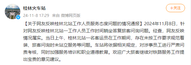 【关于网友反映桂林北站工作人员服务态度问题的情况通报】2024年11月8日,针对网友反映桂林北站一工作人员工作时间躺坐答复旅客问询问题。经查,网友反映情况属实。当日上午,桂林北站一名客运员在工作期间,存在未按工作要求规范着装、旅客问询时未站立服务等问题。车站将依据相关规定,对涉事员工进行严肃问责考核,同时加强服务培训和职业道德教育。欢迎广大旅客继续对铁路服务工作提出宝贵的意见建议。