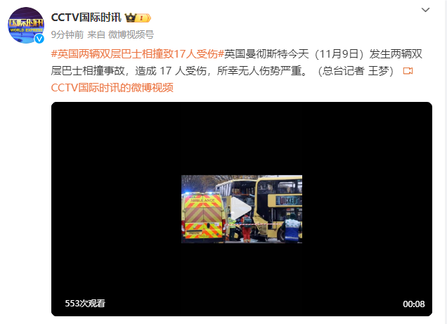 英国曼彻斯特今天(11月9日)发生两辆双层巴士相撞事故,造成 17 人受伤,所幸无人伤势严重。(总台记者 王梦)