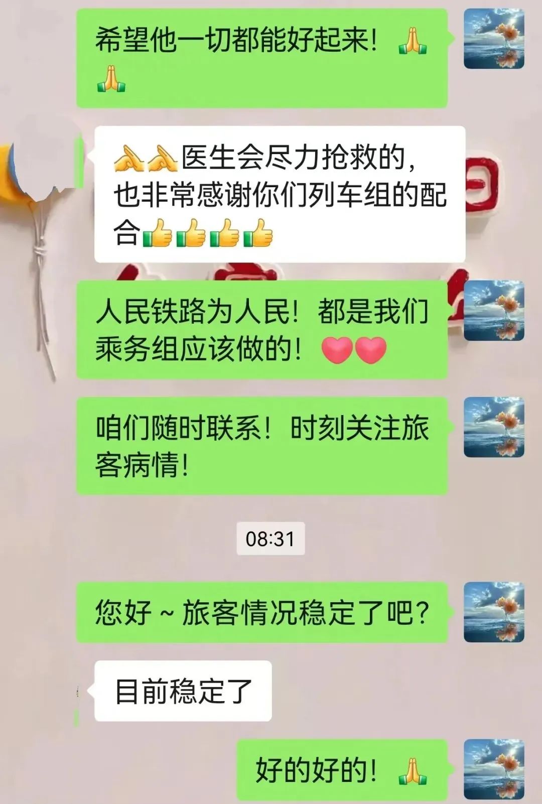 事后,列车长通过患病旅客的同伴得知旅客目前情况稳定,已经脱离生命危险。得知自己受到的紧急救助,患病旅客通过同伴向乘务组表达了感谢。