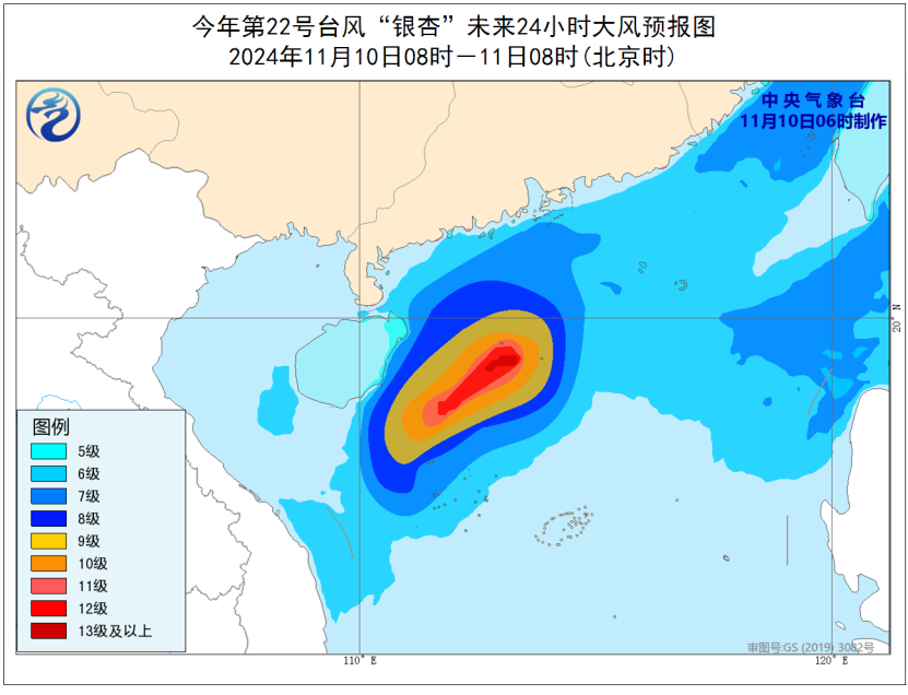 预计,10日08时至11日08时,受冷空气和台风“银杏”的共同影响,台湾海峡、南海北部和中部、西沙群岛、海南岛东部沿海、福建沿海、广东沿海将有6-8级、阵风9-10级的大风,其中南海西北部和中西部的部分海域风力可达9-11级、阵风12-13级,“银杏”中心经过的附近海域风力可达12-14级,阵风15-16级(见图2)。