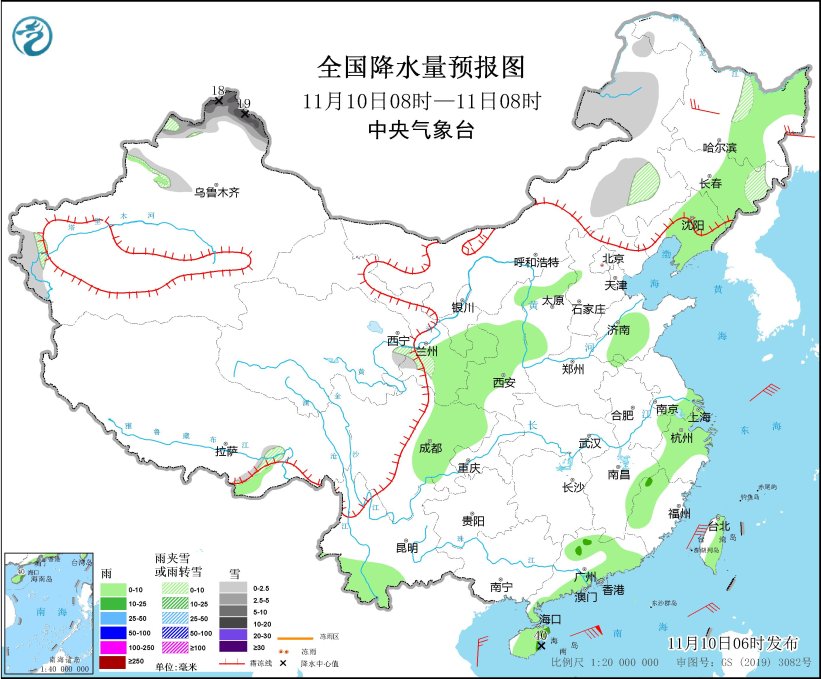 11月10日08时至11日08时,内蒙古中东部、新疆北疆北部和南疆西部山区等地部分地区有小雪或雨夹雪,其中,新疆北疆北部和北疆东部等地部分地区有中到大雪,局地暴雪(10~19毫米)。黑龙江中部,吉林中东部、辽宁中北部、青海东部、甘肃东南部、山东中南部、山西中西部、四川盆地西部、浙江大部、云南西南部、广东南部、海南岛、台湾岛大部等地部分地区有小到中雨,其中,海南岛东南部局地有大雨(25~40毫米)。内蒙古中东部、东北地区有4~5级风(见图3)。