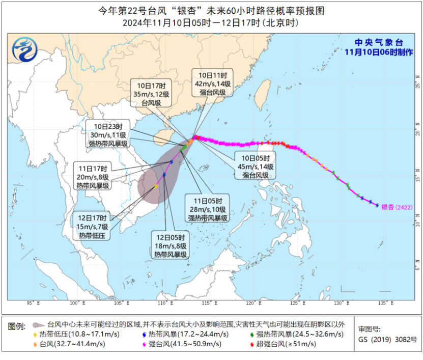 预计,“银杏”将以每小时10公里左右的速度在海南岛以东海面向西南方向移动,强度逐渐减弱,并趋向越南南部沿海(见图1)。中央气象台11月10日06时继续发布台风黄色预警。