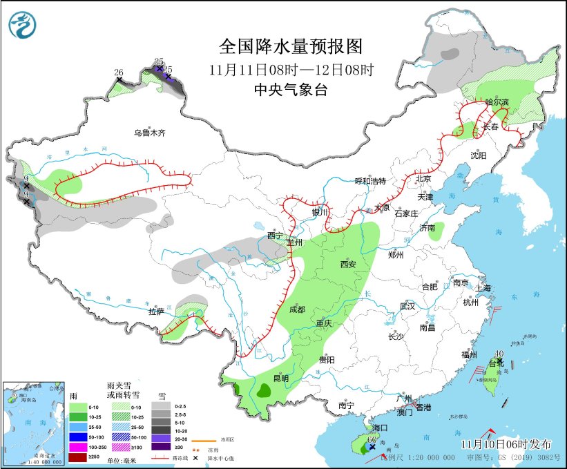 11月11日08时至12日08时,内蒙古东部、黑龙江西部、新疆北疆北部和南疆盆地、西藏西北部、青海东部和南部等地部分地区有小到中雪或雨夹雪,其中,新疆北疆北部和北疆东部等地部分地区有大到暴雪,局地大暴雪(20~26毫米)。黑龙江南部、新疆南疆盆地、甘肃东部、陕西中南部、四川盆地、云南中部、海南岛、台湾岛等地部分地区有小到中雨,其中,海南岛东部、台湾岛北部等地部分地区有大雨(25~60毫米)(见图4)。