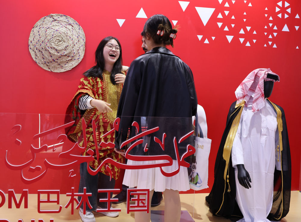11月5日,参会者在第七届进博会国家展巴林馆试穿巴林服装。新华社记者 殷刚 摄