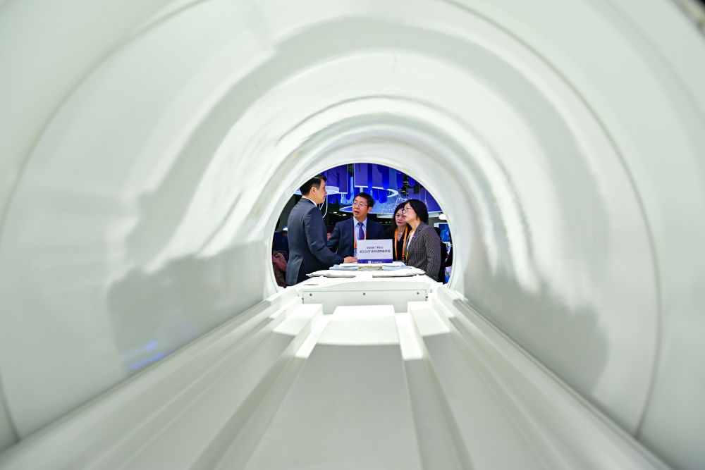 11月5日,人们在第七届进博会医疗器械及医药保健展区GE医疗展台了解一款读秒成像磁共振仪器。新华社记者 张铖 摄