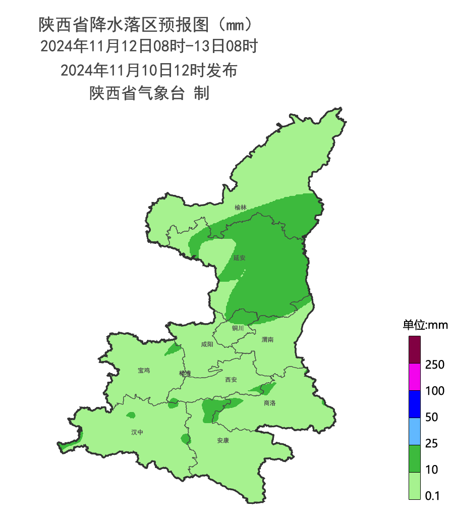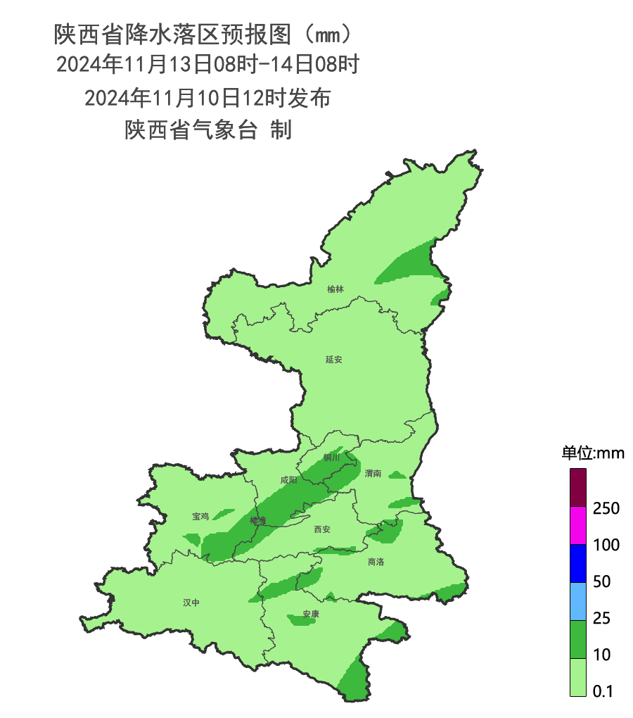 11-13日降水主要时段在12日到13日白天,其中12日(图1),全省大部有小雨(0.1-10mm),陕北南部、秦岭山区局地有中雨(10-25mm)。