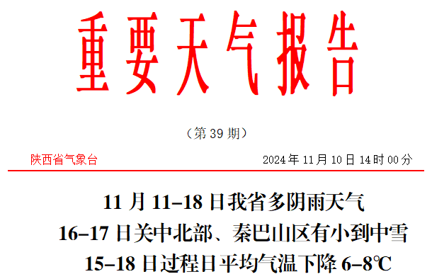 11月11-13日受短波槽东移影响,我省大部有小雨,陕北部分、关中西部及南部、陕南东部有中雨,局地大雨。11月14日降水减弱,陕北南部、陕南南部有分散性小雨。11月15-18日受较强冷空气和短波槽共同影响,我省中南部将出现持续性降水、降温天气过程,陕北南部小雨转雨夹雪或小雪,关中南部、陕南有中雨,关中南部局地、陕南部分地方有大雨,关中北部、秦巴山区有雨夹雪或小到中雪,降水期间能见度较低。11月15-18日过程日平均气温全省大部下降6~8℃,局地10℃以上,预计最低气温出现在11月19日清晨;14-19日中北部部分地方有霜冻。17-19日关中西部及北部、秦巴山区有道路结冰。