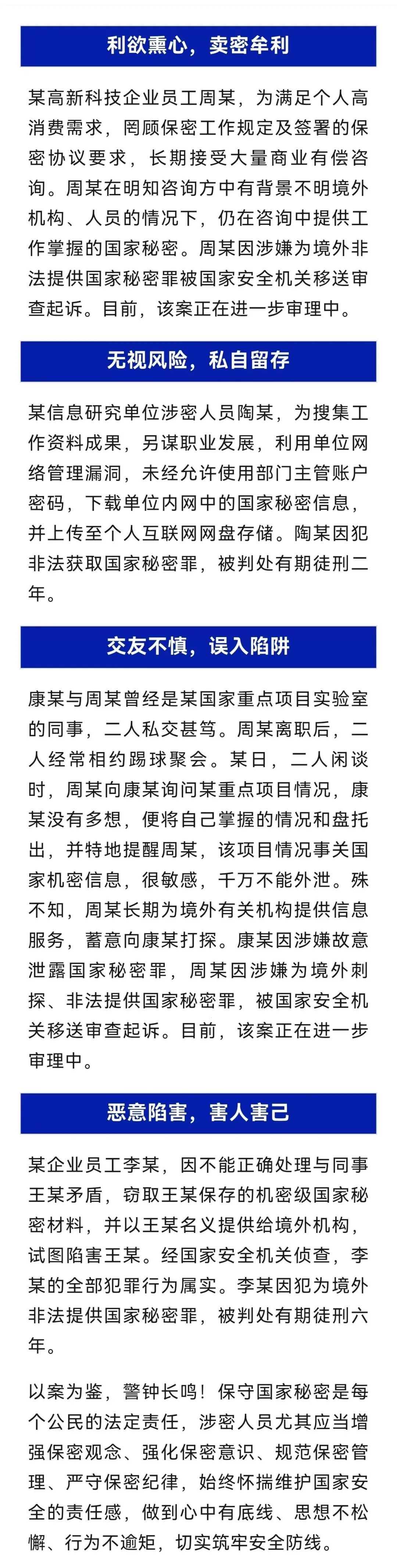 国家安全部10日发文《绷紧保密这根弦!》:在涉密岗位工作的人员统称为涉密人员,是国家秘密产生、使用和管理的主体。涉密人员管理是保密管理的核心要素和关键环节。一些涉密人员失泄密案件,相关案情触目惊心、发人深省。来源:国家安全部