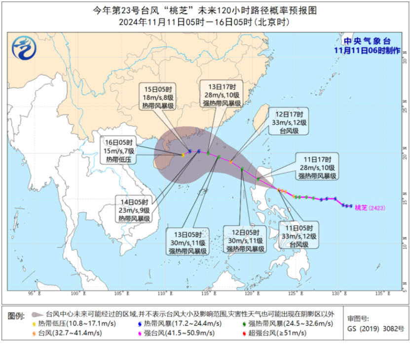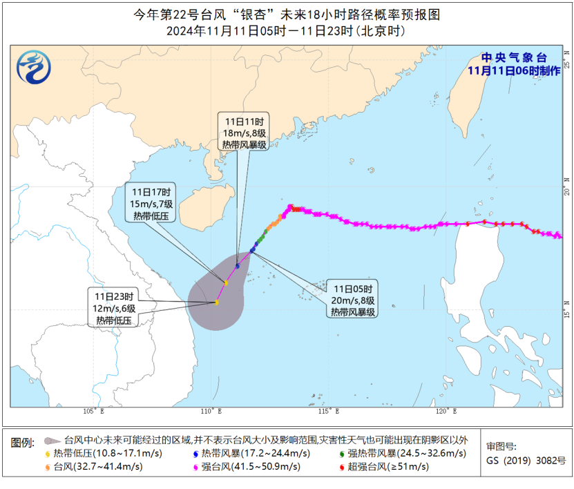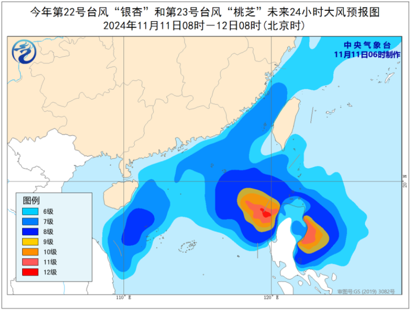 预计,11日08时至12日08时,受台风“银杏”、“桃芝”及冷空气的共同影响,台湾海峡、南海北部和中部、巴士海峡、西沙群岛、东沙群岛、海南岛东部沿海、台湾岛西部和东南部沿海、福建沿海、广东东部沿海将有6至8级、阵风9至10级的大风,其中南海中东部的部分海域风力可达9至10级、阵风11至12级,“桃芝”中心经过的附近海域和地区风力可达11至12级,阵风13至14级。中央气象台11月11日06时发布台风蓝色预警。